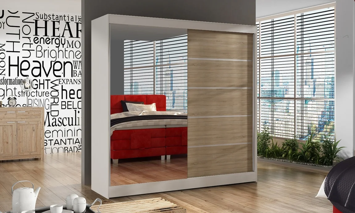 Šatní skříň se zrcadlem HEMIS III v kombinaci bílé barvy a dřevodekoru dub sonoma poskytuje praktické a stylové řešení pro ložnici. Rozměry 200 × 58 × 215 cm nabízejí dostatek prostoru pro oblečení, doplňky i sezónní věci.