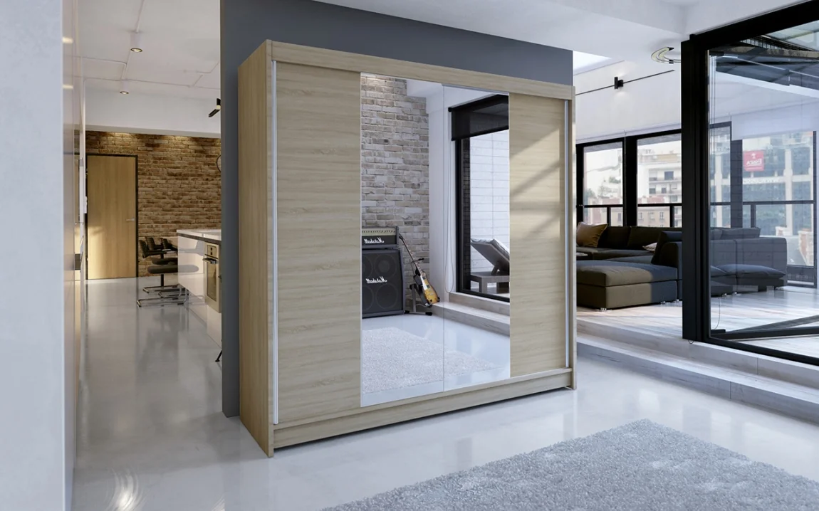 Šatní skříň se zrcadlem v dekoru dub sonoma kombinuje styl s praktickým uspořádáním pro každodenní využití. Rozměry 180 × 58 × 215 cm poskytují dostatek místa pro šaty, doplňky a další sezónní věci.