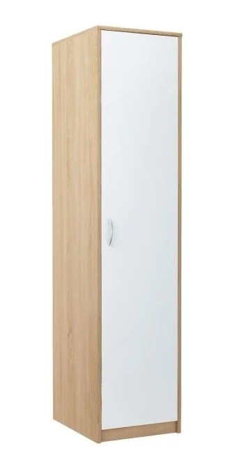 Šatní skříň SWAUN 1 v provedení dub sonoma/bílá je praktickým kouskem do každé ložnice. Korpus i dvířka jsou vyrobeny z kvalitního LTD lamina, které zajišťuje dlouhou životnost a snadnou údržbu. Korpus vyvedený ve verzi dub sonoma a dveře v matné bílé dodávají skříni svěží a moderní vzhled. Lamino je odolné vůči vysokým teplotám, poškrábání a nárazům a je opatřeno ABS hranou, která zpevní povrch i při každodenním používání. Jasně patrná struktura dřeva dodává nábytku přirozený vzhled. Rozměry: výška 193 cm, šířka 45 cm, hloubka 55 cm. Dodáváno v demontu, ale s návodem k montáži jej snadno sestavíte. Záruka 24 měsíců.