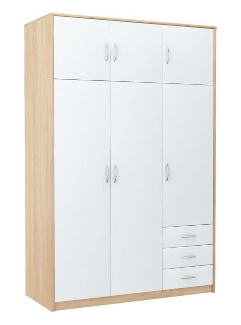 Lamino je odolné vůči poškození, vysokým teplotám a nárazům a s výraznou strukturou dřeva působí přirozeně. V pravé třetině skříně najdete 3 zásuvky a za dvířky 2 police, vlevo zůstává volný prostor se šatní tyčí a nahoře nádstavec se 3 dvířky. Rozměry: výška 193 cm, šířka 127 cm, hloubka 55 cm. Materiál: LTD (lamino). Dodáváno v demontu. Záruka 24 měsíců.