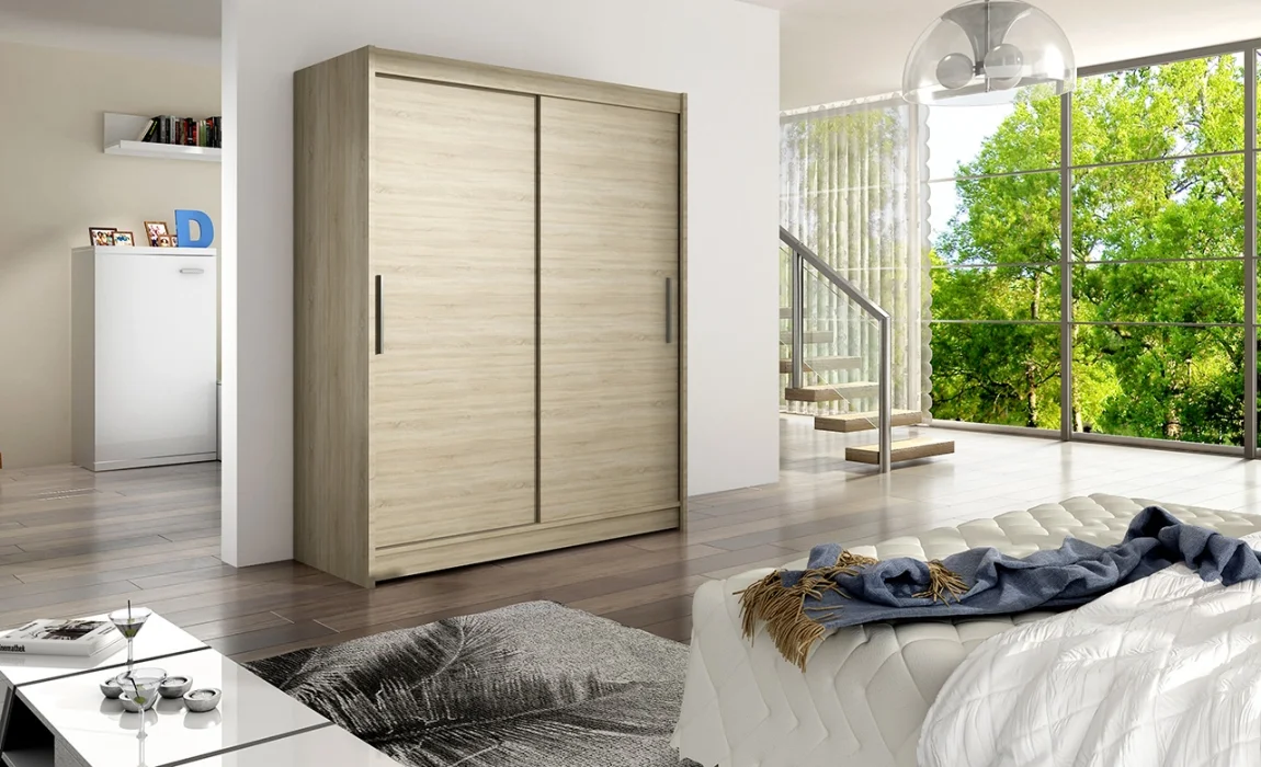 Klasická šatní skříň s posuvnými dveřmi v dekoru dub sonoma představuje praktické a prostorově úsporné řešení pro ložnici i menší prostory. Rozměry: šířka 150 cm, hloubka 58 cm a výška 200 cm.