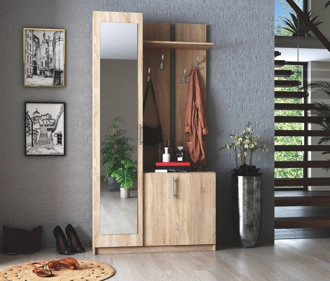 Předsíňová stěna SCOZIA představuje kompaktní řešení pro menší prostory. Sestava zahrnuje panel s věšákem a policí, botník a skříň se zrcadlem, díky nimž snadno uspořádáte vstupní zónu.