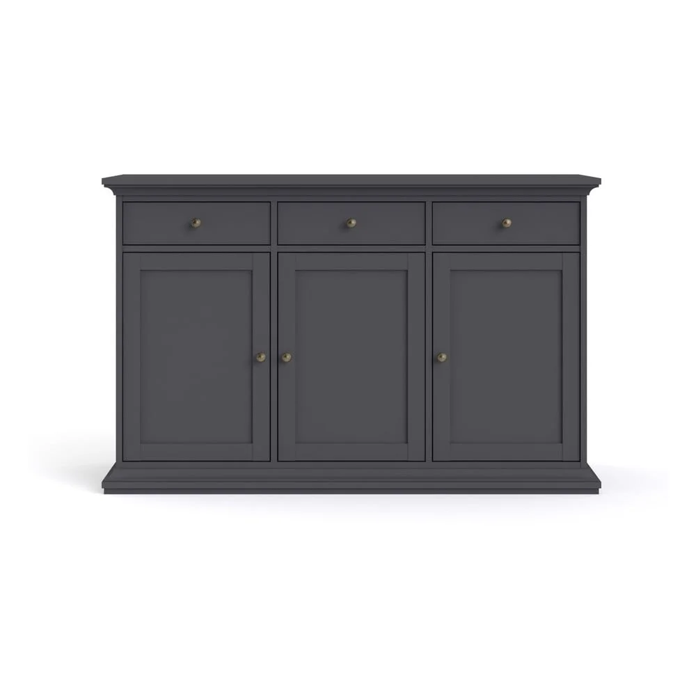 Stylová šedá nízká komoda Paris s rozměry 144x92 cm je ideálním řešením pro moderní domácnosti. Její jednoduchý a elegantní design se hodí do různých interiérů a poskytuje praktické úložné prostory.