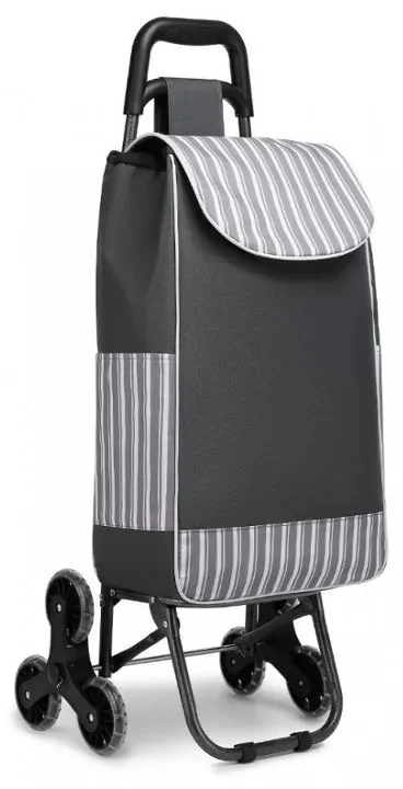 Praktická šedá nákupní taška s kolečky, navržená pro snadnou přepravu po schodech. Díky robustní konstrukci, prostornému vnitřku a stahovací šňůrce se do ní vejde až 31 litrů nákupu.