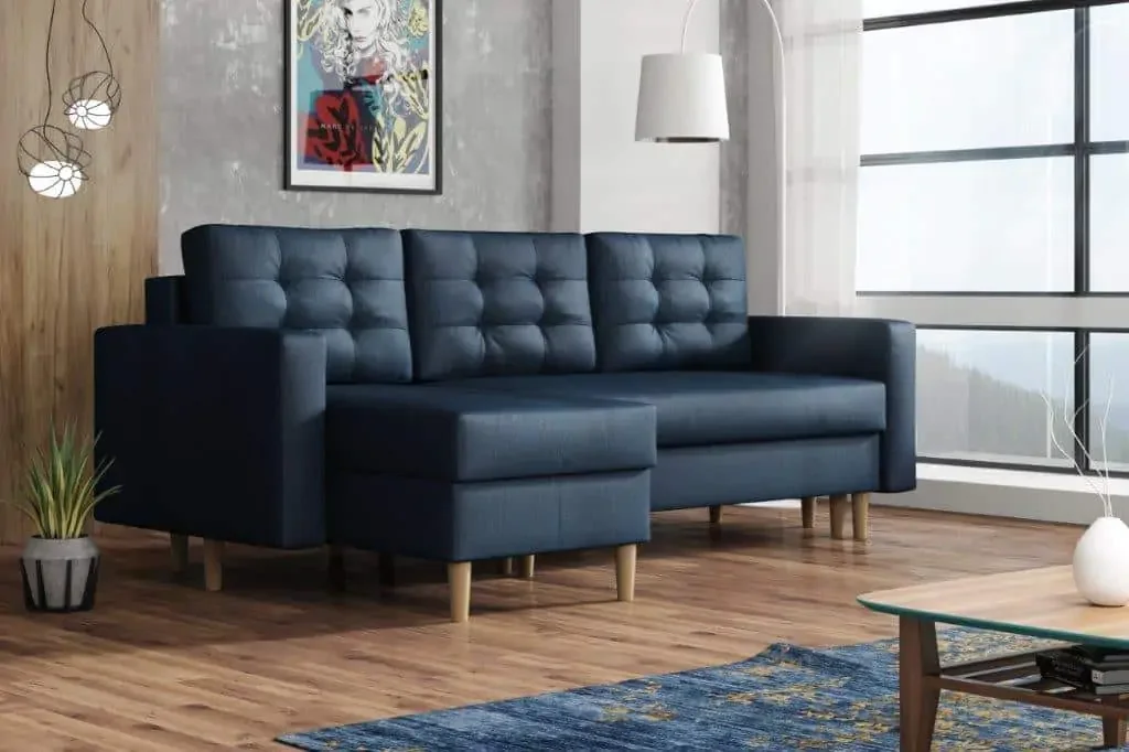 Elegantní sedací souprava Anabel v modré variantě kombinuje retro šarm s moderním komfortem. Dřevěné nohy a ozdobné detaily na opěráku dodávají nábytku charakter a lehce se hodí do různých stylů interiérů.