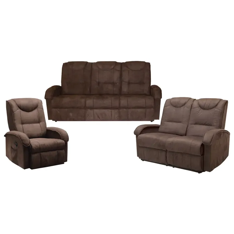 Všechny kusy mají vysokou zádovou opěrku a široká područka, takže se pohodlně sedí i při delším posezení. Po náročném dni si užijete masáž v masážním křesle a v dvojkřesle si pohodlně přečtete noviny; na rodinné oslavě se pak všichni pohodlně usadí na trojkřeslo. Povrch kompletu je vyveden v imitaci broušené hnědé kůže, díky čemuž působí luxusně a hodí se do různých interiérů. Masážní křeslo nabízí elektrické ovládání, 8 masážních programů a 2 úrovně intenzity, volbu oblasti masáže (zádová/bederní) a automatické vypnutí po 15 nebo 30 minutách; rozměry 81 × 95 × 93 cm a hmotnost 45 kg. Dvojkřeslo má jeden pevný a jeden polohovací sedák; rozměry 132 × 94 × 93 cm a hmotnost 57 kg. Trojkřeslo disponuje dvěma pevnými a jedním polohovacím sedákem; rozměry 188 × 94 × 93 cm a hmotnost 70 kg. Dodáváme v demontu. Nedělejte kompromisy mezi pohodlím a designem – tato sestava kombinuje obojí. Pro kompletní vybavení obýváku nezapomeňte na konferenční a televizní stolky; jednotlivé kusy lze pořídit i samostatně. Pohodlí je v této sadě na prvním místě a nadčasový vzhled dává každému prostoru skutečné zázemí.