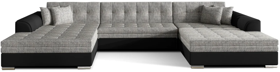 Elegantní rozkládací sedačka do tvaru U kombinuje šedou látku Berlin 01 s černou ekokůží Soft 11, čímž vzniká moderní kontrast a snadná údržba. Pro potahy jsou k dispozici dvě barvy: šedá látka Berlin 01 a černá ekokůže Soft 11.