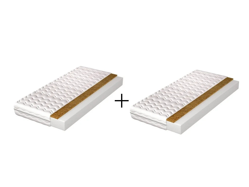 Set obsahuje dvě pěnové matrace o rozměrech 90×200 cm a výšce 10 cm. Oboustranné provedení umožňuje výběr mezi středně tvrdou a tvrdou stránkou podle Vaší preference. Jádro tvoří pěna T25 s výškou 8 cm a na jedné straně je doplněno kokosovou vrstvou 1 cm pro lepší oporu.