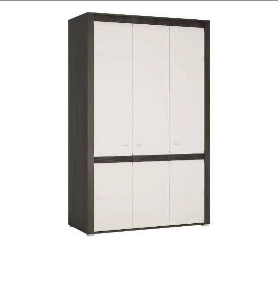 Třídvéřová šatní skříň s praktickým vnitřním uspořádáním obsahuje šest polic a jednu šatní tyč pro zavěšení oblečení. Povrch ve vzhledu norské borovice s černým a bílým leskem působí moderně a snadno se kombinuje s různými interiéry.
