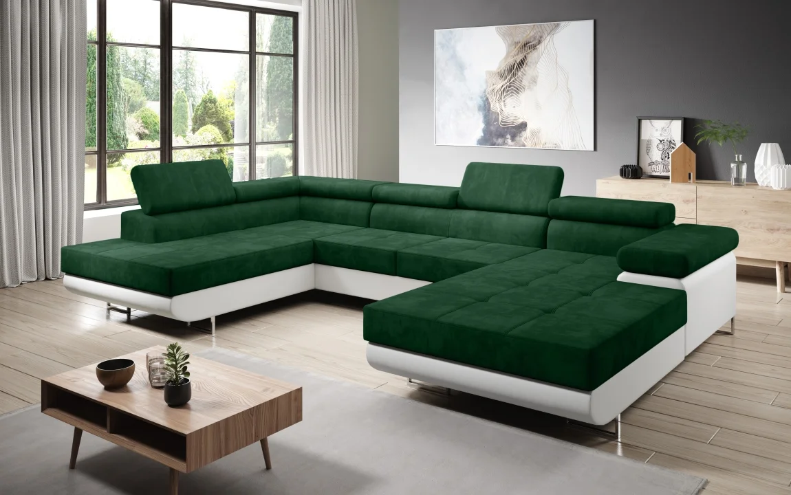 Rohová rozkládací sedačka s levým provedením je praktickým řešením pro pohodlné večery i občasné spaní. Potah kombinuje zelenou látku Kronos 19 s bílou ekokůží v provedení madryt 120.