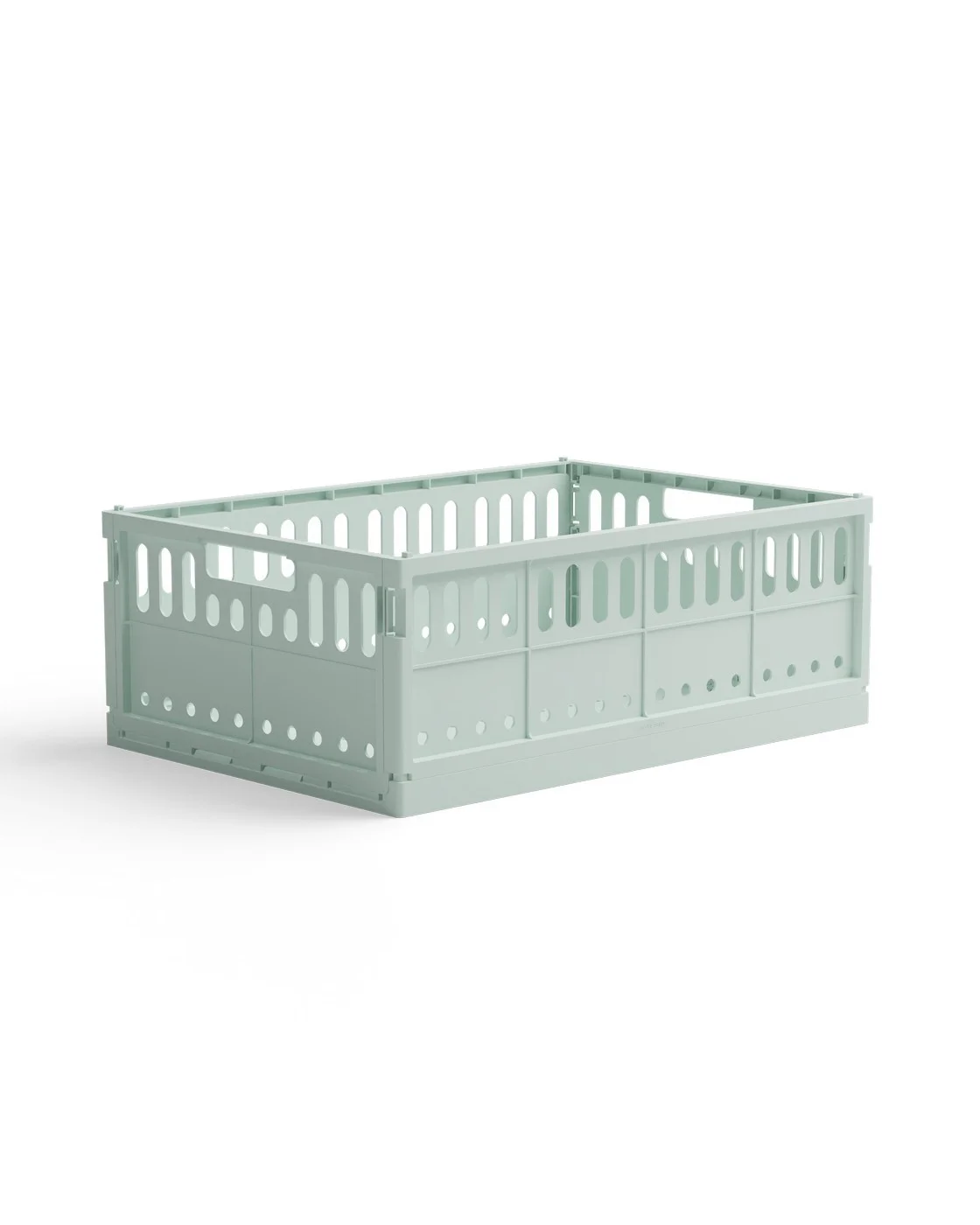 Jsou vyrobené z 100% recyklovaného plastu bez škodlivých látek, což zaručuje bezpečné a šetrné ukládání věcí. Kolekce Made Crate nabízí 20 pastelových odstínů, včetně svěží mintové varianty. Přepravky jsou stohovatelné a dodávají se ve třech velikostech: mini, midi a maxi. Dvě midi zaplní jeden maxi a dvě mini zaplní jednu midi, takže se vzájemně uzamknou a na policích se nepřevrací. Jsou lehké, snadno omyvatelné a díky praktickému skládání je lze snadno uložit. Vyrobené v Evropě z vysoce kvalitních recyklovaných materiálů.