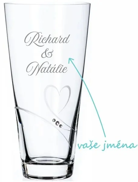 Elegantní skleněná váza o výšce 25 cm je zdobena ručně broušeným srdcem a třpytivými krystaly Swarovski Elements, které dodávají výrobku výjimečný lesk. Tato váza je vyrobena z čirého bezolovnatého křišťálového skla s precizně zabroušeným okrajem, což zaručuje její dlouhodobou krásu a vysokou kvalitu. Díky možnosti personalizace s jmény je ideální jako originální dárek k významným životním událostem nebo výročí. Váza přichází v luxusní dárkové krabičce, která podtrhuje její slavnostní charakter.