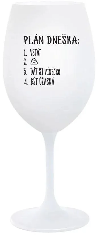 Elegantní bílá sklenice na víno o objemu 350 ml s originálním motivem PLÁN DNEŠKA - VSTÁT je ideálním doplňkem pro každého milovníka vína, který si rád zpříjemní každý den. Tento stylový kousek je nejen výjimečným dárkem pro vaše blízké, ale také praktickým pomocníkem při relaxaci po náročném dni.
