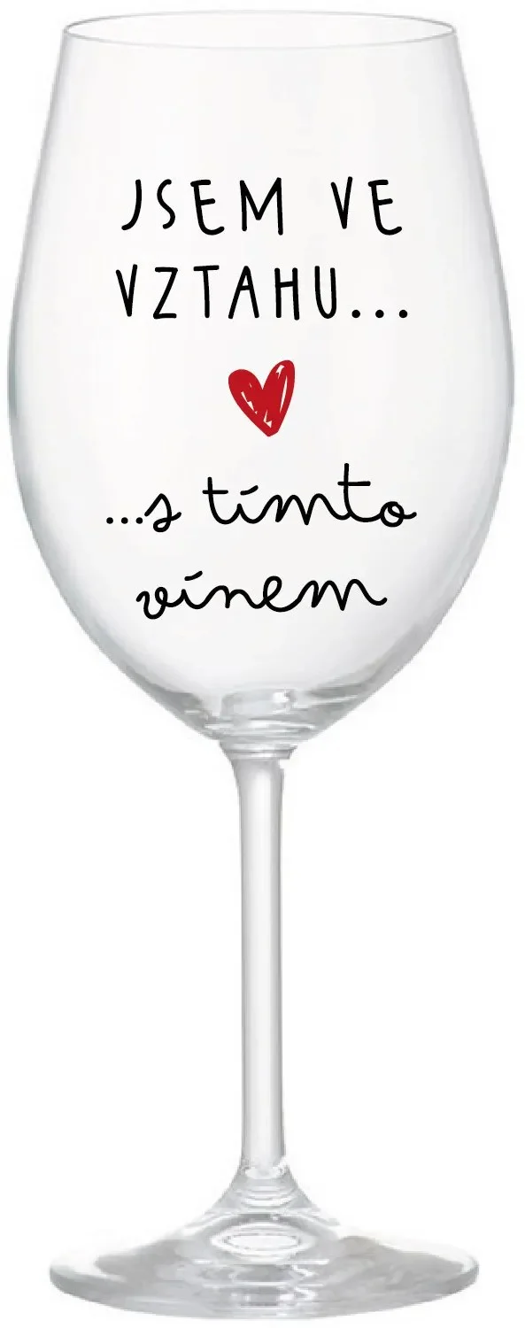 Elegantní průhledná sklenice na víno s osobitým motivem 'JSEM VE VZTAHU S TÍMTO VÍNEM' je ideální volbou jako originální dárek nebo doplněk pro vaše večery. Perfektní pro každou příležitost, ať už slavnostní či běžný večer, kdy si chcete dopřát kvalitní víno a chvíli odpočinku.