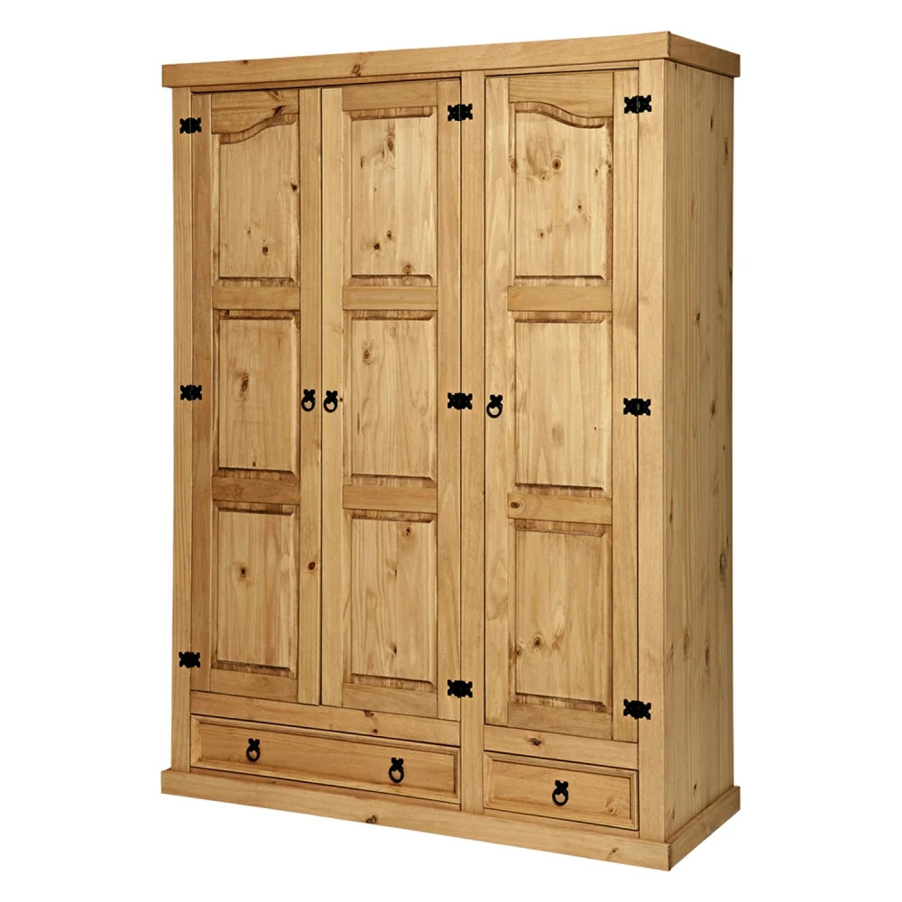 Šatní skříň s třemi dveřmi od značky PIMBOW je vyrobená z masivní borovice a povrchově ošetřena voskovanou vrstvou v medovém tónu. Rozměry jsou 151 cm šířky, 56 cm hloubky a 205 cm výšky.