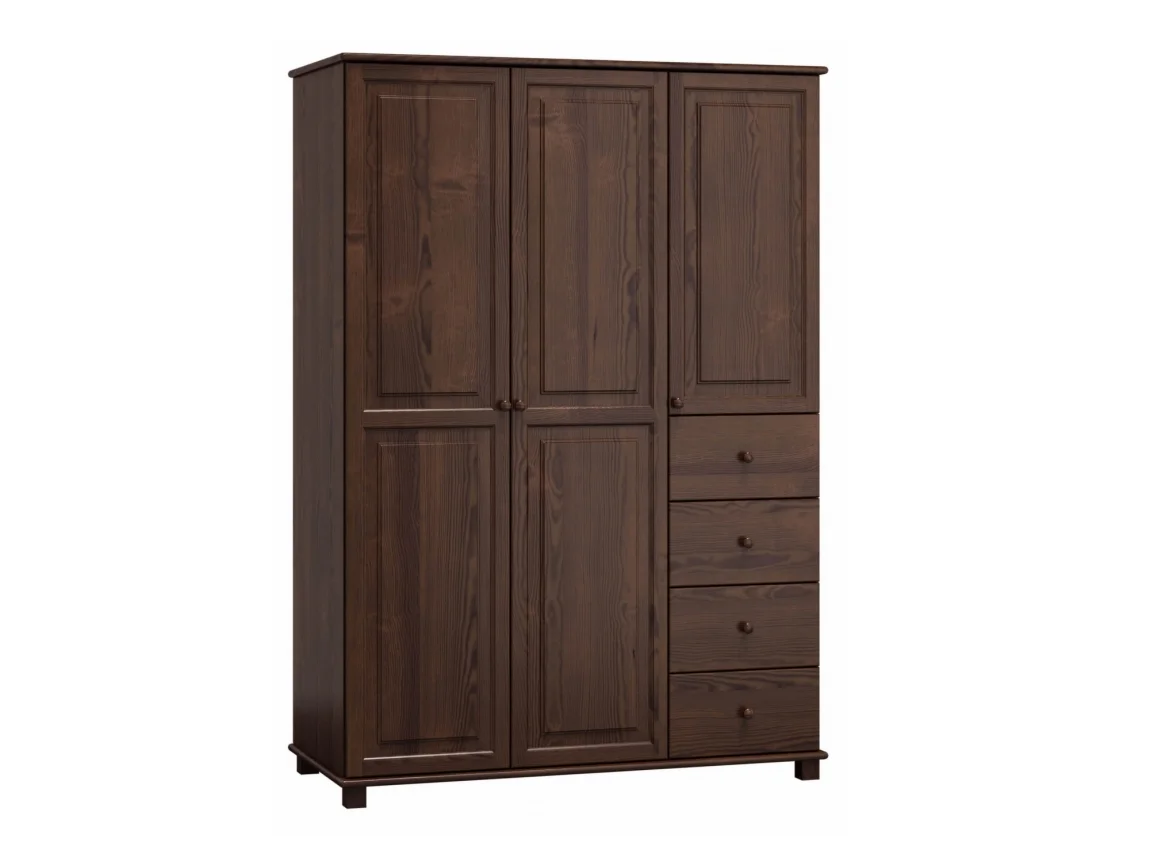 Šatní skříň se čtyřmi šuplíky je vyrobena z masiv borovice o tloušťce 2,6 cm a disponuje mořením v odstínu ořech, které zdůrazňuje kresbu dřeva. Rozměry 190 × 133 × 60 cm nabízejí dostatek místa pro oblečení i doplňky. Dodáváno v demontu, což usnadňuje dopravu a montáž u vás doma. Konstrukce je pevná a stabilní, díky čemuž skříň slouží dlouhou dobu a ráda ji zabydlíte v moderním interiéru.