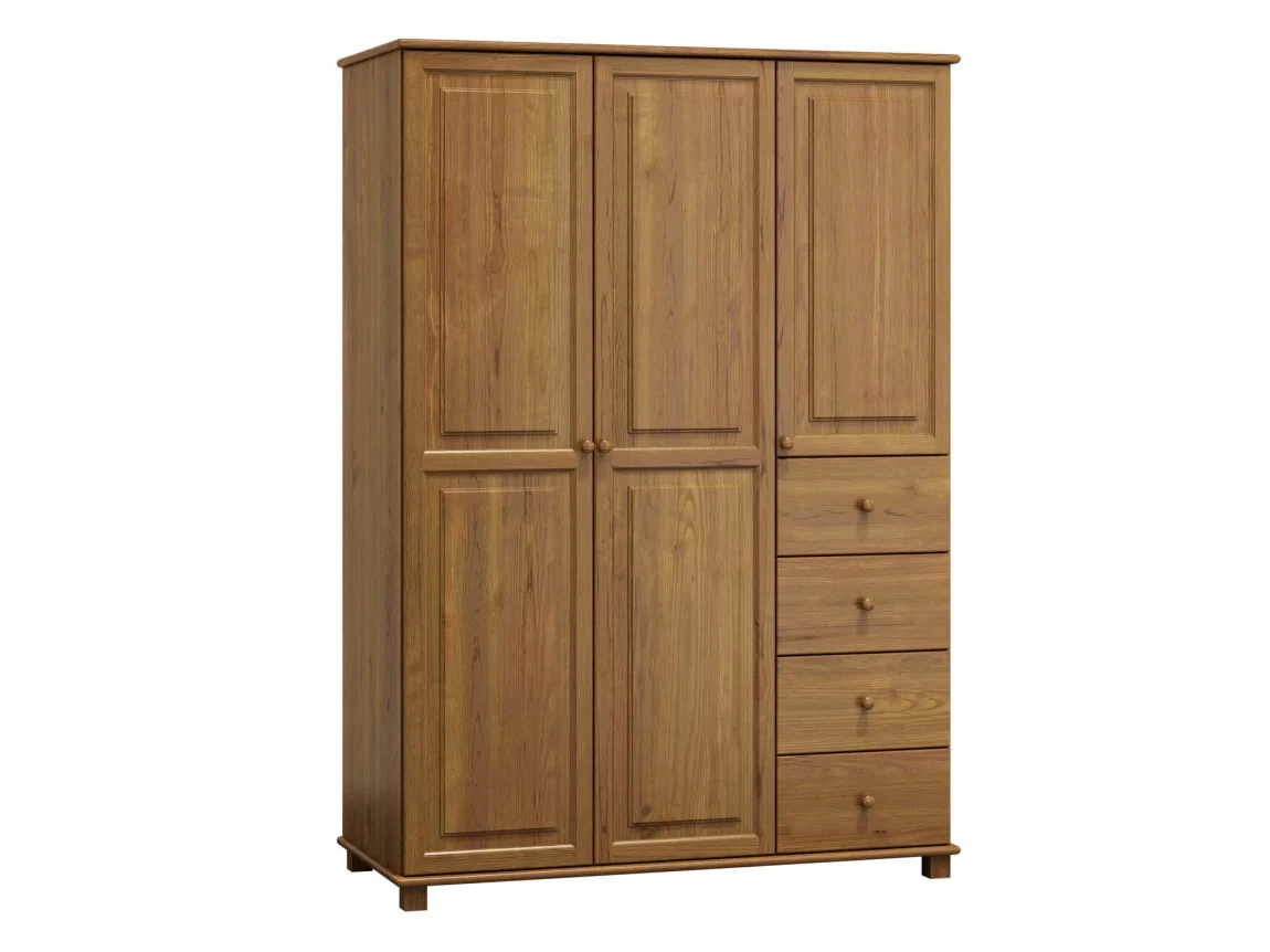 Šatní skříň BHAGIRA 4 kombinuje praktičnost s přírodním vzhledem díky masiv borovice a tloušťce dílů 2,6 cm. Uvnitř najdete čtyři šuplíky pro snadnou organizaci oděvů a doplňků. Povrch je upraven mořením v barvě dub, které dodává teplý a nadčasový vzhled. Rozměry jsou 190 cm na výšku, 133 cm na šířku a 60 cm do hloubky. Dodáváno v demontu pro rychlou montáž. Tento kus vyniká dlouhou životností díky masivní konstrukci a nadčasovému designu, který se hodí do ložnice i šatny. Jeho neutrální barevné zpracování snadno zapadne do různých interiérů a díky tomu se stane praktickým i estetickým doplňkem vašeho domova.