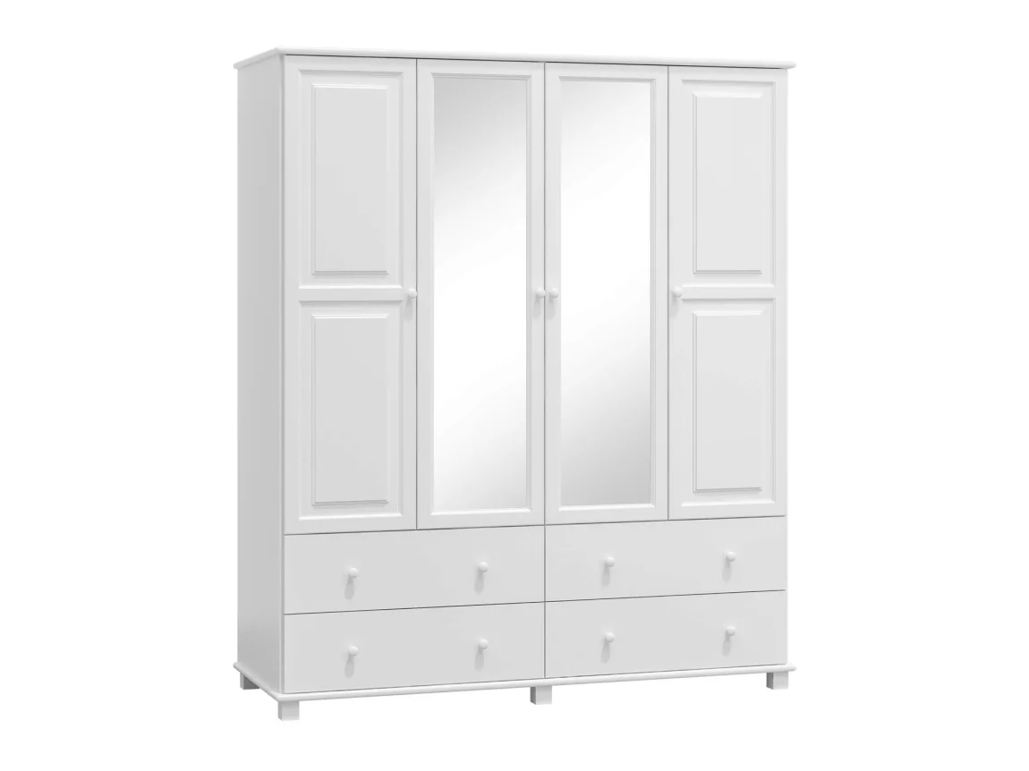 Kombinovaná šatní skříň se zrcadlem je vyrobená z masivního borovicového dřeva o tloušťce 2,6 cm, což zajišťuje pevnost a dlouhou životnost. Barva moření je bílá a světlé provedení jednoduše zapadne do různých interiérů a vizuálně rozšíří prostor.