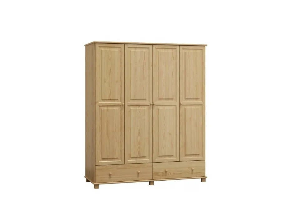 Čtyřdveřová šatní skříň vyrobená z masivního borového dřeva o tloušťce 2,6 cm kombinuje pevnost s přírodním vzhledem. Rozměry: 190 cm výška, 160 cm šířka a 60 cm hloubka poskytují dostatek místa pro ukládání oblečení.