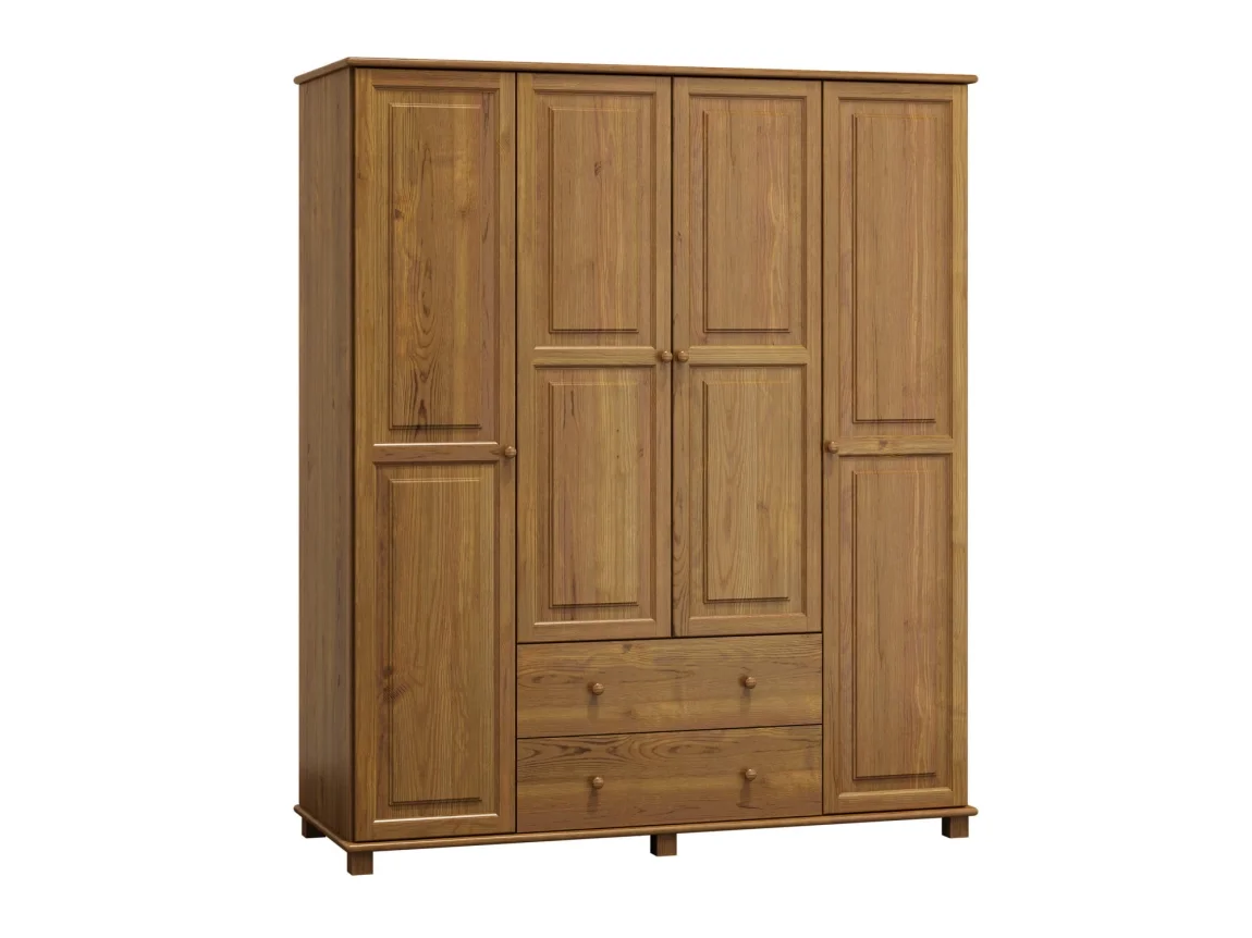 Kombinovaná šatní skříň z masivu borovice s tloušťkou 2,6 cm spojuje přírodní vzhled s vysokou pevností. Barva moření dub dodává teplý a nadčasový odstín, který se hodí do většiny interiérů.