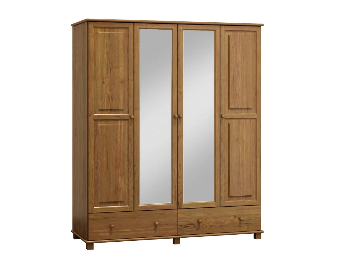 Kombinovaná šatní skříň s integrovaným zrcadlem pro pohodlné oblékání a praktické denní použití. Vyrobena z masivní borovice s tloušťkou 2,6 cm a povrchově upravena do odstínu dub. Rozměry: výška 190 cm, šířka 160 cm, hloubka 60 cm.