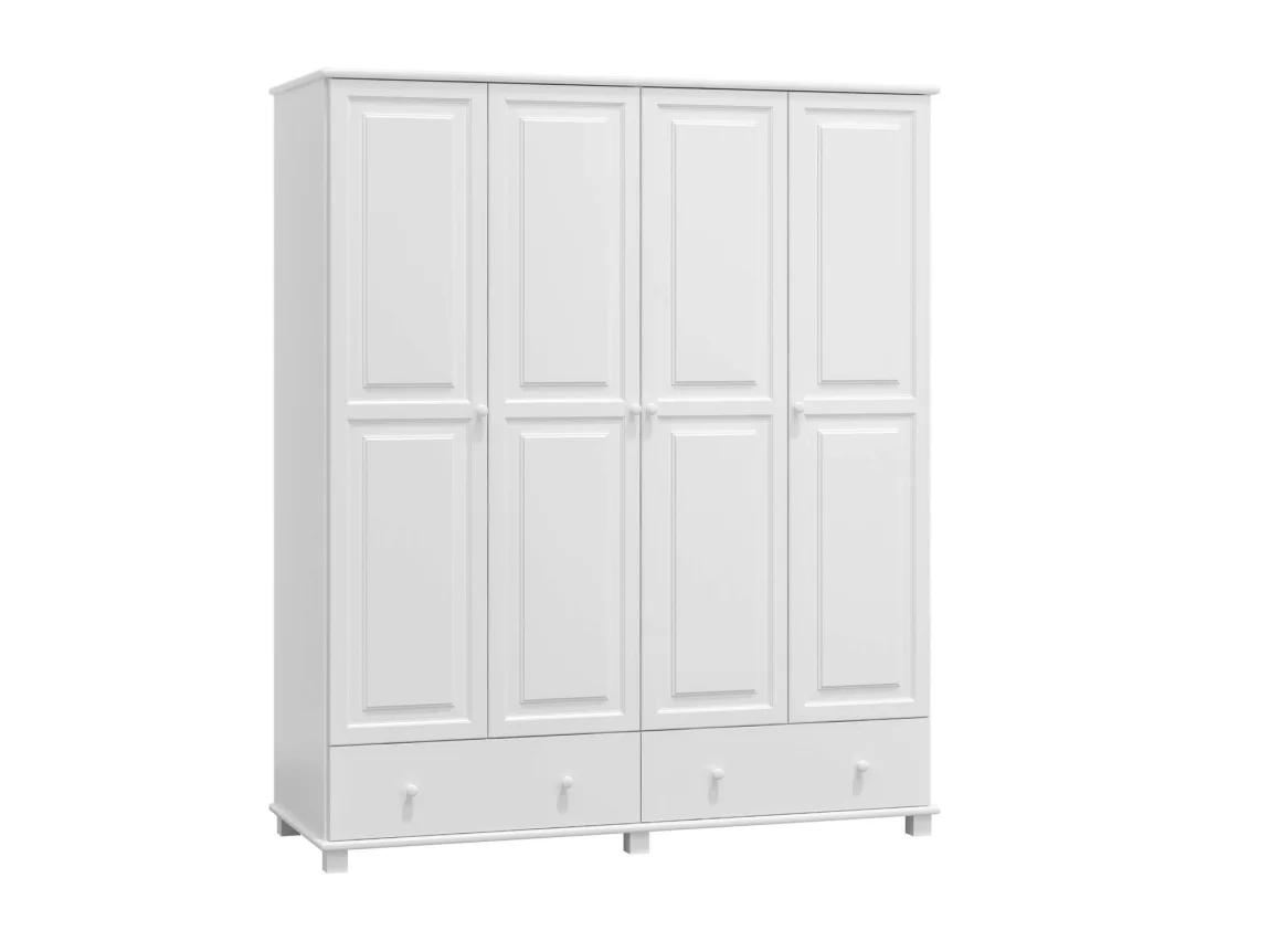 Čtyřdveřová šatní skříň vyrobená z masivní borovice s tloušťkou panelů 2,6 cm zaručuje pevnost a dlouhou životnost. Povrch je ošetřený bílým mořením, které dodává svěží a nadčasový vzhled.