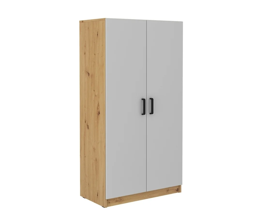 Stylová šatní skříň v kombinaci dub artisan a světle šedé barvy dodá interiéru moderní vzhled. Rozměry: šířka 79,9 cm, výška 153,6 cm a hloubka 43,6 cm. Korpus i dvířka jsou vyrobeny z lamina (tloušťka 18 mm pro korpus, 16 mm pro dvířka) s PVC hranami 1 mm, což zajišťuje dlouhou životnost a snadnou údržbu. Úchyty jsou kovové a podtrhují celkový vzhled. Dodáváme v demontu, takže montáž zvládnete sami a zboží dorazí v bezpečném balení. Tato skříň je ideální volbou pro efektivní uspořádání oděvů a doplňků, zároveň působí elegantně a prakticky.