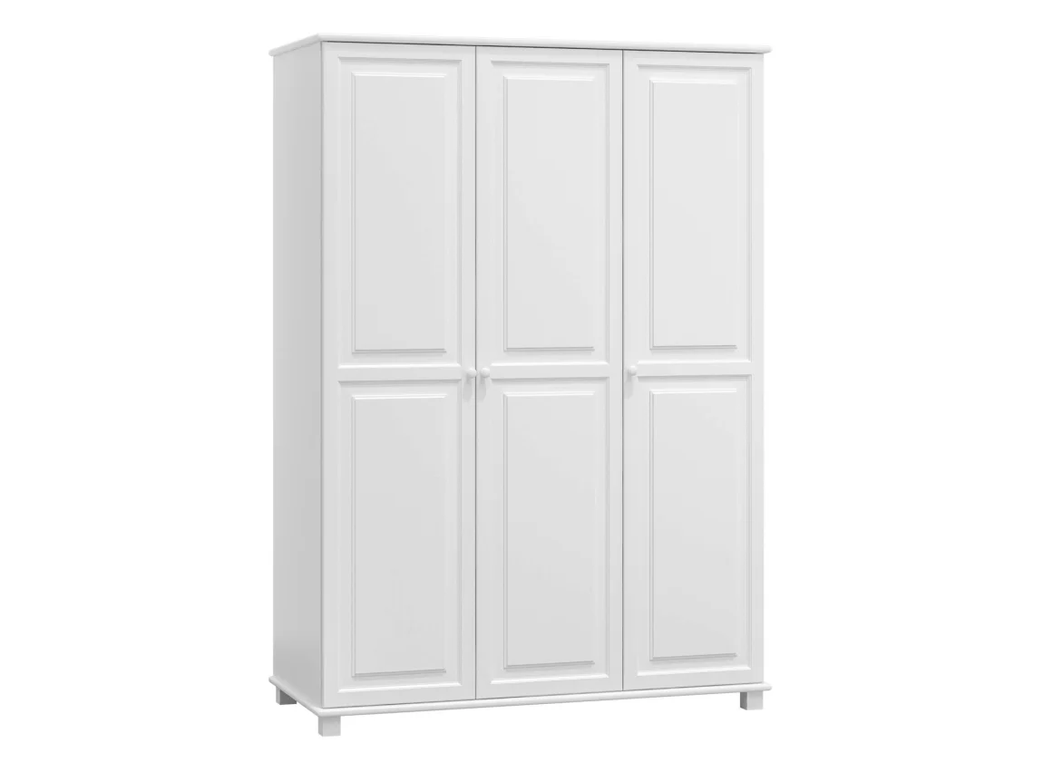 Praktická třídveřová šatní skříň z masivní borovice s tloušťkou korpusu 2,6 cm nabízí pevnou konstrukci a nadčasový vzhled. Povrch je bílé moření, které zvýrazňuje kresbu dřeva a snadno se sladí s různými styly interiéru.