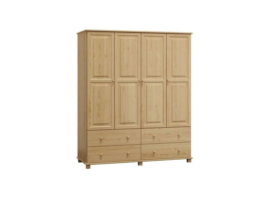 Čtyřdveřová šatní skříň vyrobená z masivní borovice s tloušťkou 2,6 cm nabízí pevnou a odolnou konstrukci. Rozměry: výška 190 cm, šířka 180 cm, hloubka 60 cm. Dodávána v demontu pro pohodlnou přepravu a rychlou montáž.
