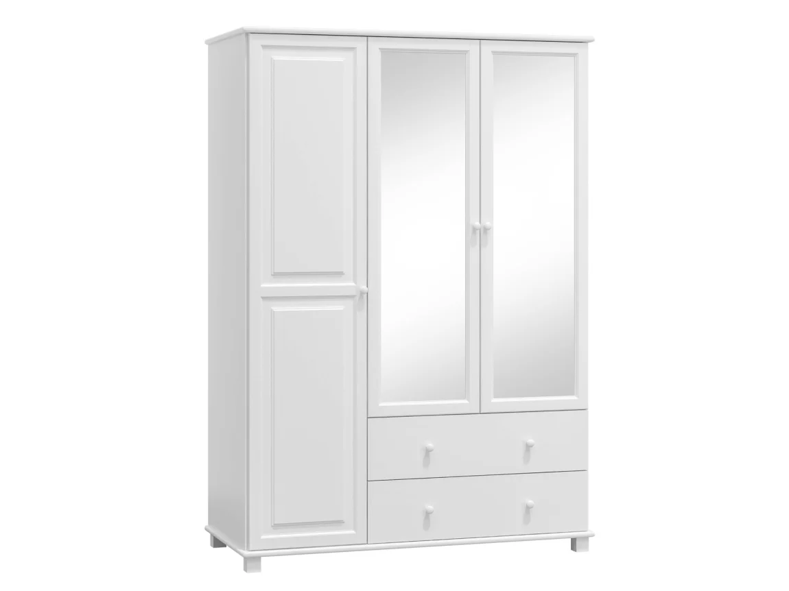 Šatní skříň se zrcadlem je vyrobená z masivu borovice o tloušťce 2,6 cm a díky bílému moření působí svěže a nadčasově. Rozměry 190 cm vysoké, 120 cm široké a 60 cm hluboké poskytují dostatek úložného prostoru pro šatstvo a doplňky. Dodávána v demontu usnadňuje dopravu a montáž u vás doma. Kombinuje pevnost masivního dřeva s praktickým zrcadlem a hodí se do moderních i skandinávských interiérů, čímž slibuje dlouhou životnost a spolehlivost.