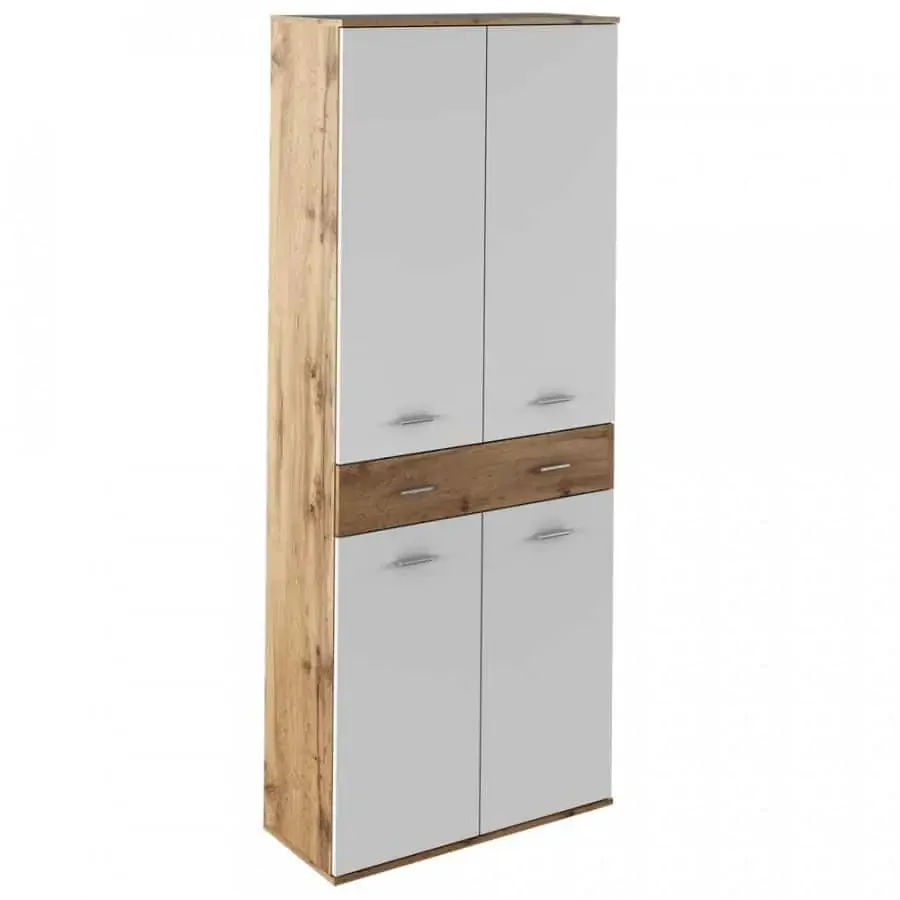 Čtyřdveřová policová skříň ze série CYRIL kombinuje teplý dub Wotan s čistou bílou pro moderní vzhled. Je vyrobena z laminované DTD desky, která zajišťuje snadnou údržbu a dlouhou životnost. Rozměry (ŠxHxV): 80 × 35 × 199 cm. Dodávána v demontu, usnadňuje dopravu a montáž. Skříň nabízí robustní police a dostatek úložného prostoru, ideální pro organizaci věcí v obývacím pokoji či pracovně. Díky čistým liniím a kontrastu barev se výborně hodí do moderních interiérů a zaujme svou univerzálností. Kvalitní slovenský výrobek s pečlivým zpracováním podporuje dlouhodobou spolehlivost.