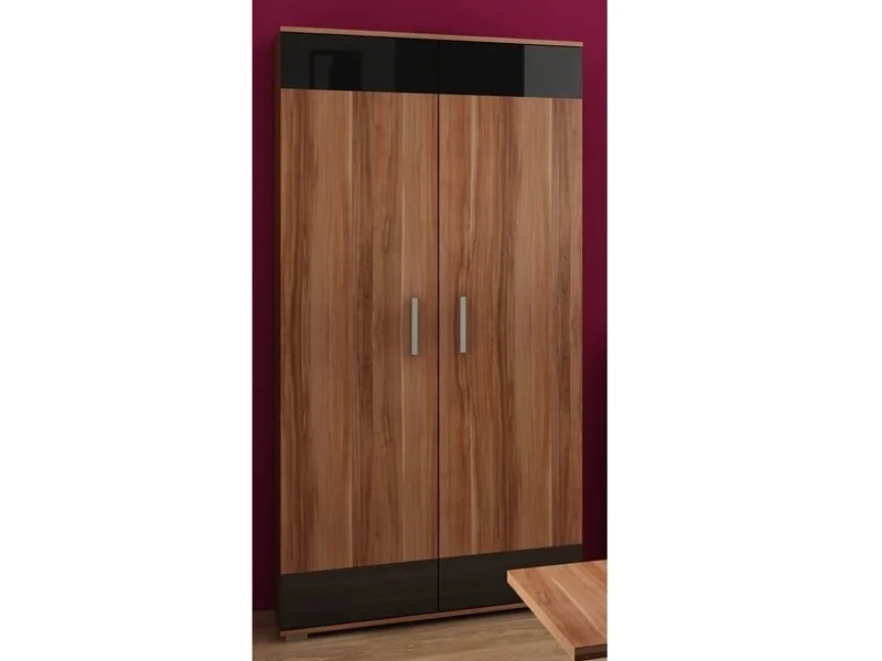 Skříň DAMARA představuje moderní spojení švestka/černý lesk s odolným laminátovým povrchem o tloušťce 16 mm a ABS hranou 0,6 mm, což zajišťuje dlouhou životnost a snadnou údržbu. Rozměry 90 × 190 × 52 cm (š × v × h) poskytují dostatek prostoru pro oblečení a doplňky.