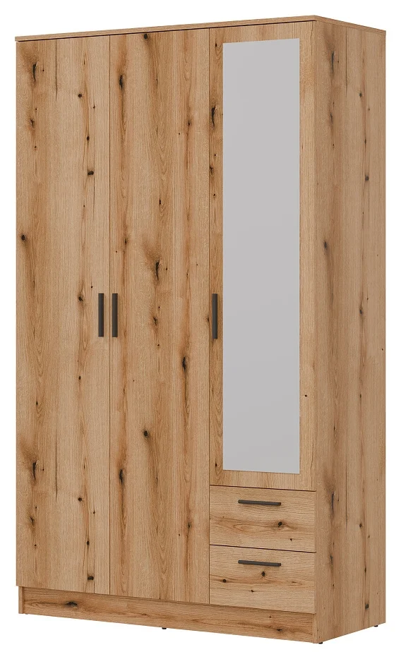 Elegantní kombinovaná šatní skříň se zabudovaným zrcadlem slouží jako praktické úložné řešení pro šaty i doplňky. Uvnitř najdete dvě šatní tyče, tři police a dvě zásuvky, což usnadní organizaci a přehledné roztřídění oděvů.