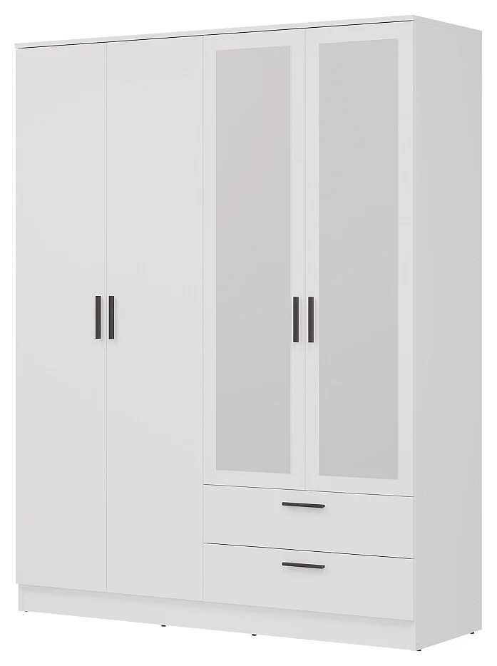 Kombinovaná šatní skříň se zrcadlem nabízí praktické řešení pro uskladnění oděvů. Vnitřní prostor je řešen dvěma šatními tyčemi, třemi policemi a dvěma zásuvkami, které usnadní organizaci drobných věcí i dlouhých oděvů. Povrch s bílým matným provedením dodává skříni svěží a moderní vzhled. Rozměry 160 × 204,7 × 52 cm a vyrobeno z lamina zaručují pevnost a snadnou údržbu. Dodání probíhá v demontu, což usnadňuje dopravu a montáž v bytě.