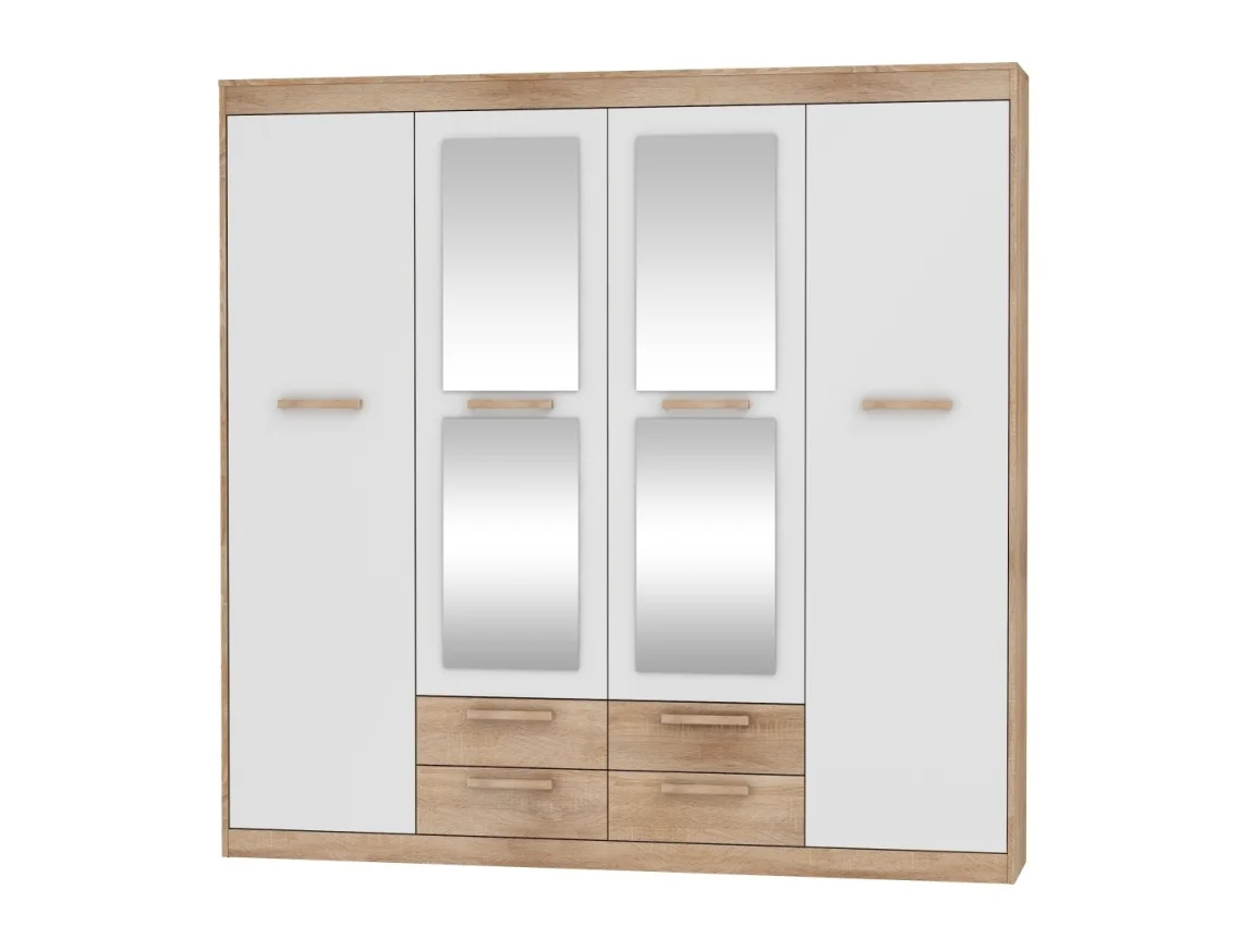 Skříň GATTON 4D4S kombinuje dub sonoma s bílým leskem pro moderní vzhled a snadné sladění s různými interiéry. Rozměry 196 cm na šířku, 210 cm na výšku a 60 cm do hloubky poskytují dostatek prostoru pro šaty, bundy i doplňky.