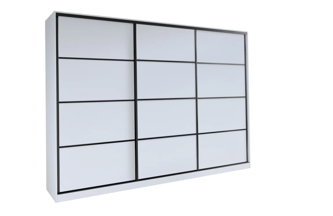 Elegantní šatní skříň HARAZIA 280 se posuvnými dveřmi kombinuje praktické rozvržení se stylovým vzhledem. Na dveřích není nutné instalovat ozdobné lišty, takže získáte hladké plochy bez zbytečných prvků. Rozměry 280 x 205 x 56 cm ve spojení s lamino povrchem v bílé matné barvě zajišťují snadnou údržbu a odolnost vůči nárazům při každodenním používání. Uvnitř najdete 6 polic, 2 šatní tyče a 4 šuplíky pro přehledné a elegantní uspořádání oblečení a doplňků. Dodáváno v demontu, montáž zvládnete snadno svépomocí, a navíc lze volitelně doplnit ozdobné lišty pro individuální vzhled interiéru.
