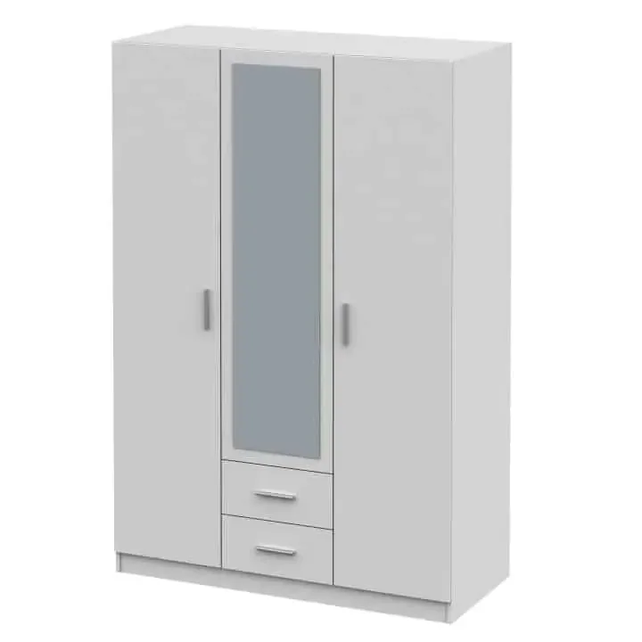 Prostorná třídveřová šatní skříň se zrcadlem a dvěma zásuvkami je vyrobena z bílé laminované dřevotřísky. Ke skříni lze doplnit i další kousky ze stejné řady a jednoduše tak vytvořit jednotný vzhled v ložnici či předsíni.