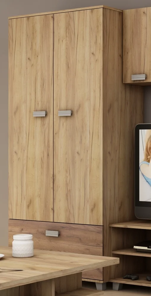 Skříň KEATING kombinuje praktické výklopné dvířky v dolní části s nadčasovým vzhledem v barevném provedení craft zlatý a craft tobaco. Je vyrobena z lamina tloušťky 16 mm, což jí dodává pevnost a dlouhodobou odolnost.