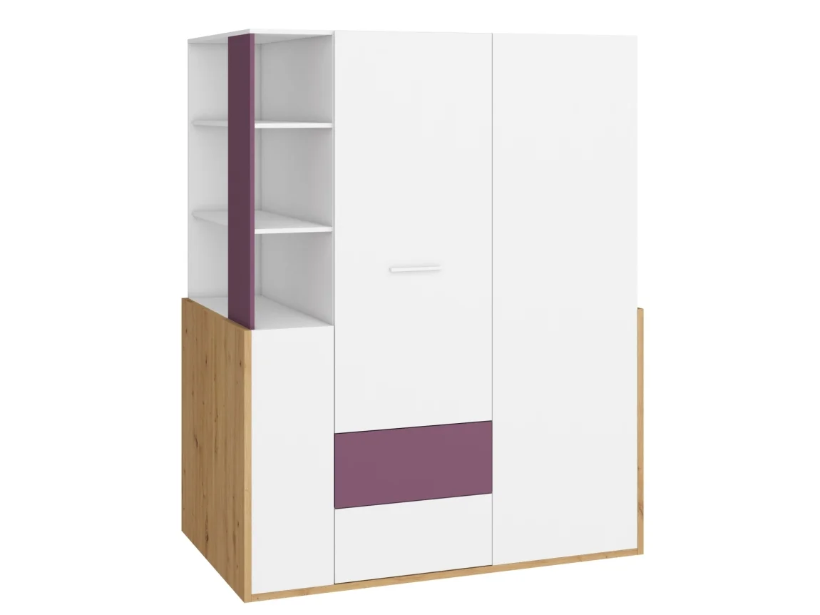 Provedení kombinuje barvy dub artisan, bílou a fialovou, s bílými úchytkami pro svěží kontrast. Rozměry: 155 cm šířky, 195 cm výšky a 96 cm hloubky. Materiál je lamino, korpusy mají tloušťku 25 mm, dvířka a ostatní prvky 16 mm, což zajišťuje pevnost a dlouhou životnost. Zásuvky i dvířka disponují systémem tichého dovírání, pro bezhlučné a plynulé otevírání i zavírání. Dodáváno v demontu. Záruka 5 let. Vhodná pro moderní i tradiční interiéry a díky univerzálnímu barevnému provedení ji snadno sladíte s dalším nábytkem.