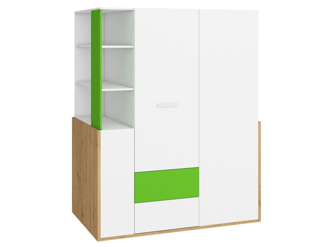 Provedení kombinuje dub artisan, bílou a zelenou, s bílými úchytkami pro svěží vzhled do moderního interiéru. Rozměry skříně: šířka 155 cm, výška 195 cm a hloubka 96 cm. Materiál tvoří lamino; korpusy mají sílu 25 mm, dvířka a ostatní části 16 mm. Zásuvky i dvířka disponují systémem tichého dovírání, což zajišťuje tichý a klidný chod. Dodáváno v demontu a s 5letou zárukou.