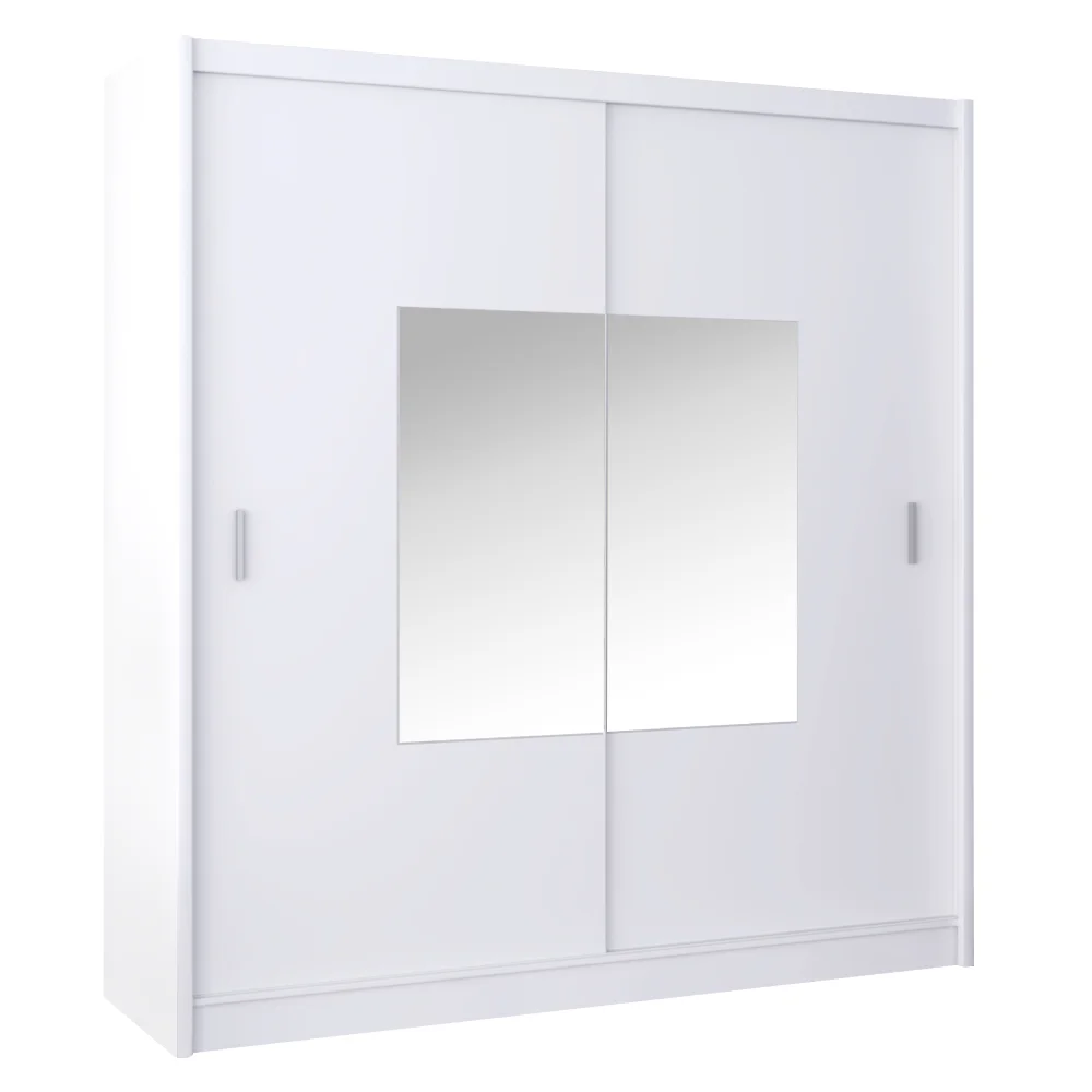 Konstrukce kombinuje laminovanou DTD desku s ABS hranami a MDF fóliované lišty, povrch doplňuje sklo a zrcadlo na dveřích. Barva je čistě bílá a rozměry činí 203 × 61 × 215 cm. Dveře jsou posuvné a jedny z nich skrývají integrované zrcadlo. Uvnitř je věšáková tyč a policová část s nosností až 5 kg na polici a 5 kg na věšák. Tloušťka materiálu DTD dosahuje 1,6 cm. Plastové úchytky ve tvaru obdélníku jsou ve stříbrné barvě. Dodáváno v demontu. Díky světlému provedení a zabudovanému zrcadlu skříň opticky zvětší prostor a působí moderně. Posuvné dveře šetří místo a usnadňují manipulaci i v menších prostorech.