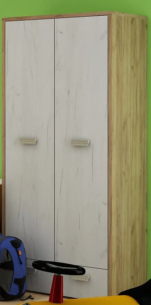 Šatní skříň s praktickou zásuvkou kombinuje moderní vzhled a pevnou konstrukci. Provedení v barvách craft zlatá a craft bílá se hodí do různých interiérů a dodává svěží, světlý dojem.