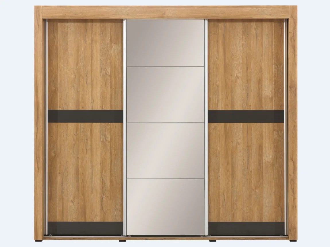 Skříň posuvná KITONGO 9 spojuje moderní design s praktickým uspořádáním pro váš domov. Korpus v provedení dub granson doplňují dveře s kombinací dub granson a grafit, čímž vzniká nadčasový vzhled vhodný do ložnice i obývacího prostoru.