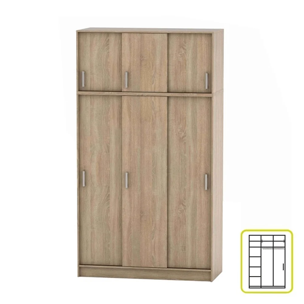 Skříň s posuvnými dveřmi je vyrobena z laminované DTD desky v provedení dub sonoma, což zajišťuje odolnost a nadčasový vzhled. Rozměry: šířka 133,7 cm, výška 240 cm a hloubka 58,4 cm; tloušťka lamina činí 1,6 cm pro pevnou konstrukci.