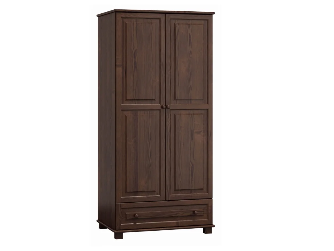 Skříň šatní 2D BHAGIRA 1 představuje praktické řešení pro organizaci šatníku s odděleným prostorem a zásuvkou. Vyrobena z masiv borovice o celkové tloušťce 2,6 cm, v odstínu moření ořech, se hodí do různých interiérů.