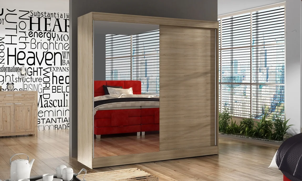 Skříň s zrcadlem HEMIS I v provedení dub sonoma spojuje moderní vzhled s praktickým řešením. Rozměry: šířka 200 cm, hloubka 58 cm a výška 215 cm poskytují dostatek místa pro šatní oděvy i doplňky.