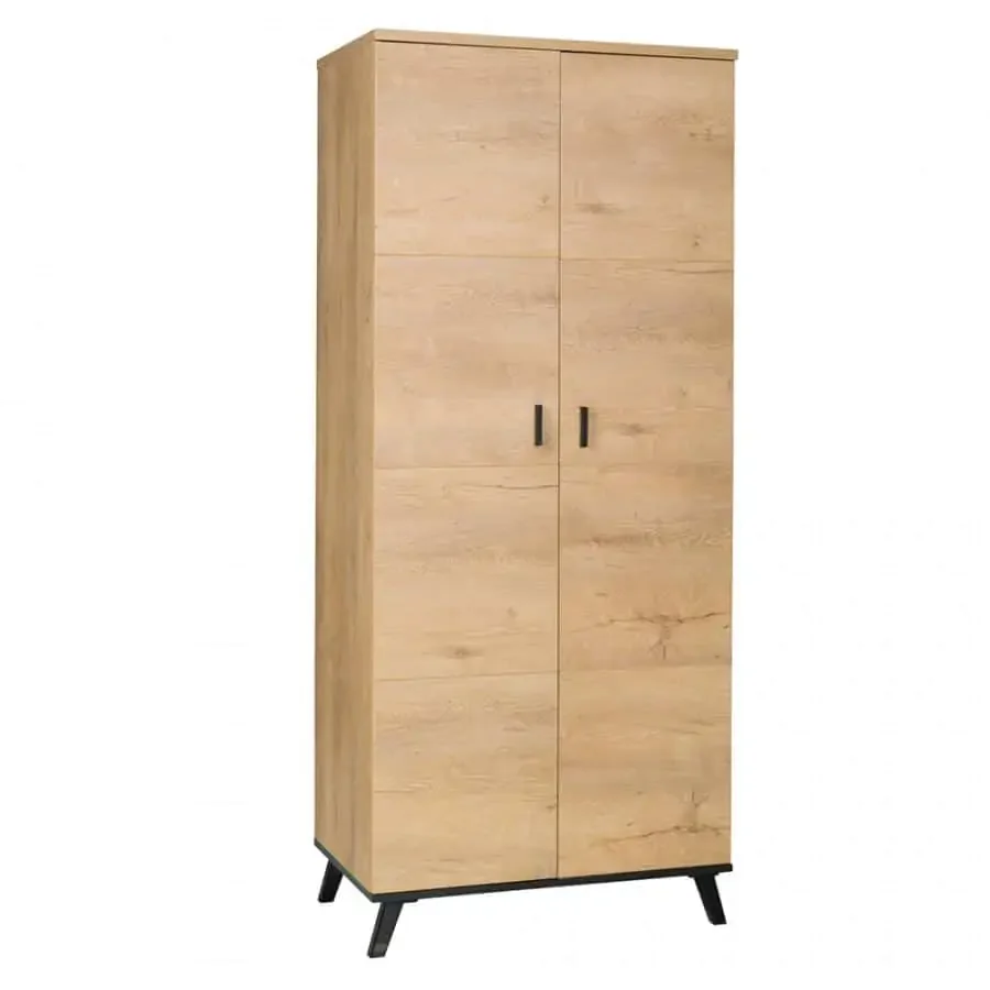 Skříň SIRAN TYP 1 se hodí do obývacích pokojů, jídelních koutů, ložnic i pracoven. Dvoudveřová skříň ukrývá věšákovou tyč a polici, takže pohodlně pojme šaty i doplňky. Je vyrobená z laminované DTD s ABS hranami v barevném provedení dub lefkas/černá a stojí na plastových nožkách.