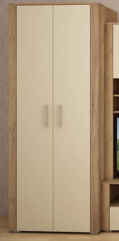 Dvoukřídlá skříň WUBIN v provedení craft zlatý a krém přináší elegantní vzhled s jemnými dekory. Dekory jsou sladěny podle pořadí korpus / dvířka / boční lišty, čímž vzniká jednotný vizuální efekt.