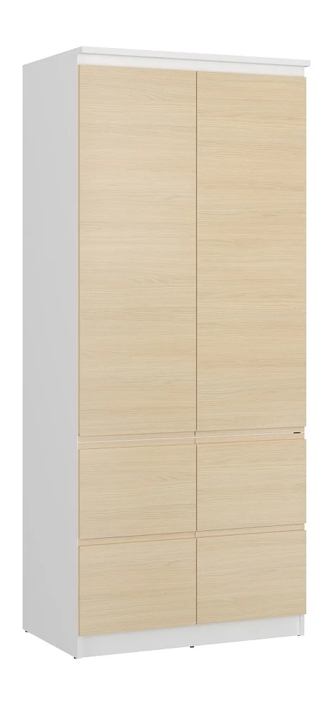 Skříň ZAIRE 2D4S v kombinaci alpská bílá a dub Vincenzo nabízí praktické rozdělení s 2 dveřmi a 4 policemi pro dostatek úložného prostoru. Je vyrobena z lamina a MDF, což zajišťuje pevnou konstrukci a snadnou údržbu. Rozměry 91,1 cm na šířku, 213 cm na výšku a 58,5 cm do hloubky poskytují dostatek místa pro šatní věci i doplňky. Dodáváno v demontu, ale s jednoduchým návodem a rychlou montáží. Díky světlému provedení a nadčasovému designu se hodí do různých interiérů a opticky rozšíří prostor místnosti.