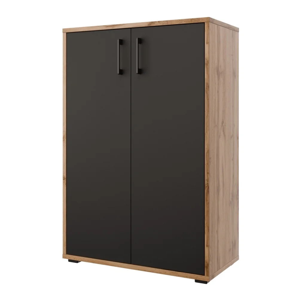 Skříňka GIANNI PREMIUM typ 1 kombinuje elegantní dvoubarevné provedení s praktickým vnitřním uspořádáním. Korpus v dekoru dub wotan a dvířka v antracitové barvě vytvářejí moderní kancelářský vzhled.